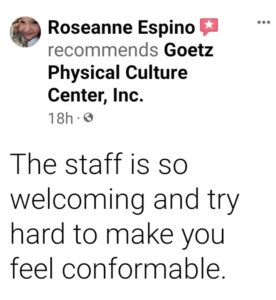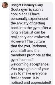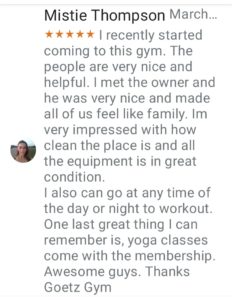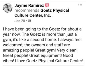 “Great gym.! Great atmosphere! Awesome owners.! Even if you came by yourself, you’re never alone at Goetz. Don’t hesitate to ask and someone with knowledge can direct you. Thanks Mark and Rad G.!!”
