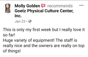 “I’ve enjoyed 5 months working out at Goetz. Wish I’d started earlier! Super friendly and helpful staff.”