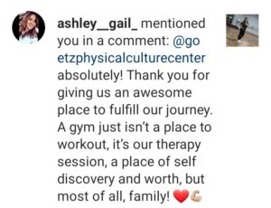 “I highly suggest yall check out Goetz Physical Culture Center! Great place to workout! I LOVE working out with trainer Michael Coursey! He’s fun, creative, strong and gives tough love when you need a kick in the pants. Best part of my day, thanks guys.”