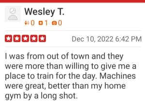 “Wanted to say thank you again for the hospitality y’all have shown me at the gym. There’s nothing like being somewhere that a person’s well-being is just as important to the owners as it is to yourself. Y’all are what motivators and gym owners are supposed to be like in my opinion. The way y’all Interact with people is amazing.”
